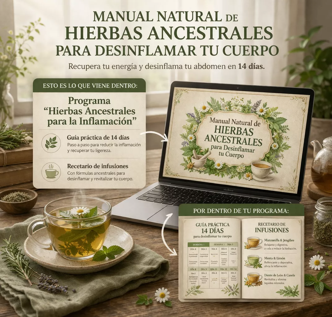 Este manual digital que por ahora cuenta con - 75% OFF, está ayudando a mujeres que no están “enfermas”, pero tampoco se sienten bien. Desinflama tu abdomen, date energía y claridad mental — de forma natural. Es una guía donde aprendes con un protocolo claro de 14 días que hacer para desinfmarte. Aprende sobre las hierbas ancestrales que preparaban nuestros abuelos y como consumirlas.