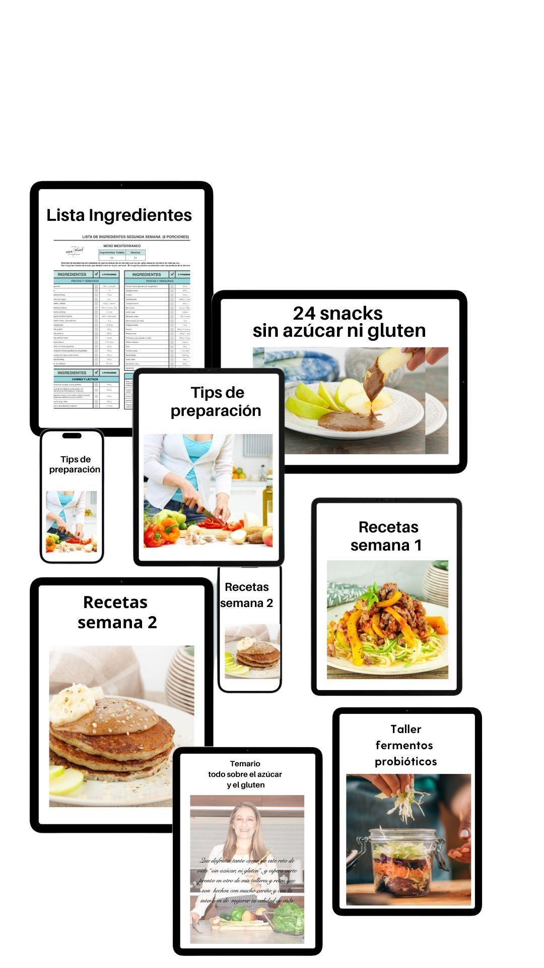 Te ayudará de una manera fácil a cambiar tus hábitos de una forma más divertida, deliciosa y retándote a cumplir tus deseos de estar más saludable. Con un Temario para que sepas todo sobre el azúcar y el Gluten. Y esto te dará más herramientas para convencerte de lo bueno que será para ti retarte y lograr tus objetivos.